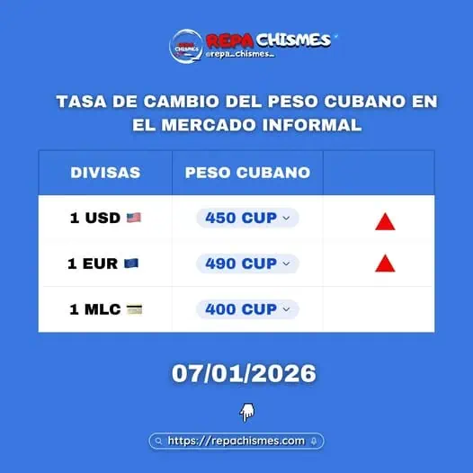 Al amanecer del 7 de enero, el dólar estadounidense se cotizó en 450 pesos cubanos (CUP), encadenando su tercer día consecutivo de subidas y reafirmando un movimiento que parece lejos de agotarse. La moneda europea no se quedó atrás: el euro dio un salto más brusco y alcanzó los 490 CUP, cinco pesos por encima de su valor anterior. Mientras tanto, la Moneda Libremente Convertible (MLC) permaneció estable en 400 CUP, aunque bajo la sombra de un mercado cada vez más volátil.