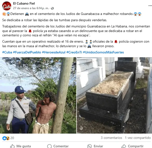 Según informaron los trabajadores del camposanto, el individuo ya estaba siendo vigilado por la policía debido a sospechas de actividades ilegales en el lugar. Finalmente, el 16 de enero de 2025, la policía lo atrapó en el acto y lo arrestó. La noticia fue dada a conocer a través del perfil oficial “El Cubano Fiel”, que publicó una imagen del presunto ladrón detenido, lo que desató una ola de comentarios de indignación entre los usuarios.