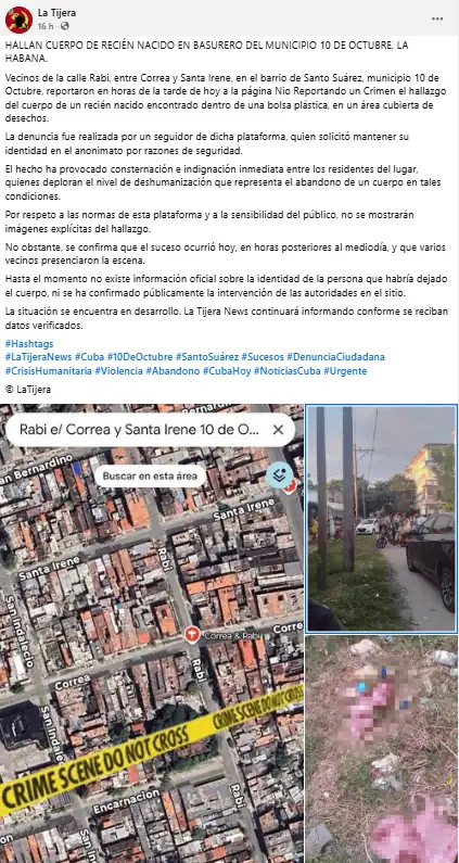 El municipio 10 de Octubre, en La Habana, amaneció bajo una profunda consternación tras descubrirse el cuerpo sin vida de un bebé en una zona cercana a la esquina de Rabí y Correa, en el reparto Santo Suárez. El menor fue encontrado entre áreas con hierba, próximo a varios contenedores, una escena que rápidamente movilizó a los residentes y activó los mecanismos de respuesta de las autoridades.