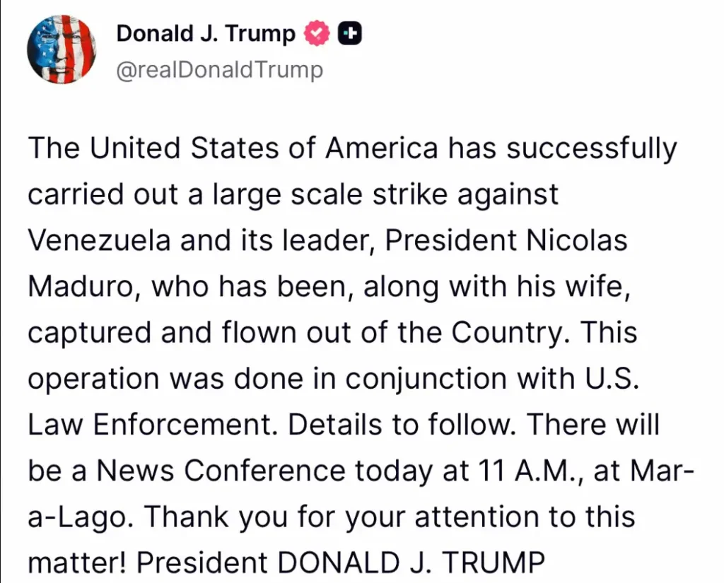Una fuerte sacudida política estremeció este sábado a Venezuela y a buena parte del continente americano tras las declaraciones del presidente estadounidense Donald J. Trump, quien afirmó públicamente que Nicolás Maduro y su esposa, Cilia Flores, fueron detenidos durante una operación militar ejecutada por fuerzas de Estados Unidos.