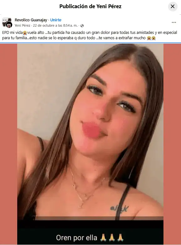 La partida de Marcia ha dejado un vacío inmenso entre sus familiares y amigos, quienes la recuerdan como una muchacha alegre, trabajadora y llena de sueños. En plataformas digitales, los mensajes de despedida se multiplican: “Vuela alto, mi vida…”, escribió una amiga en el grupo de Facebook Revolico Guanajay. “Tu pérdida nos ha dejado sin palabras, nadie esperaba algo tan duro. Te vamos a extrañar siempre”.
