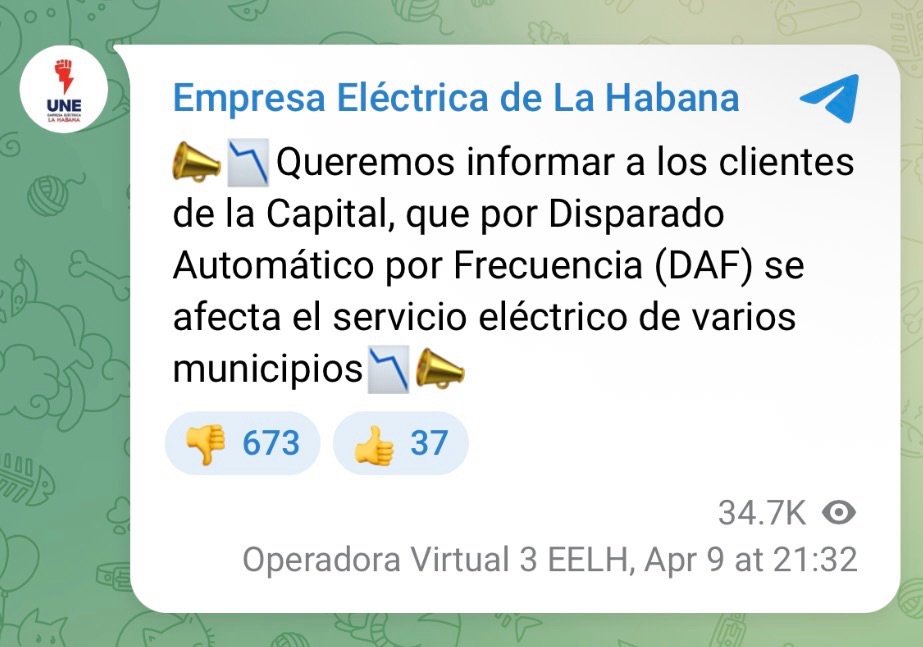 Un nuevo incidente en el sistema eléctrico nacional provocó interrupciones del servicio en distintos puntos de La Habana, generando otra jornada de incertidumbre para miles de residentes de la capital cubana. La situación fue confirmada por la empresa encargada del suministro eléctrico, que explicó que el evento estuvo relacionado con un mecanismo de protección automática dentro de la red.