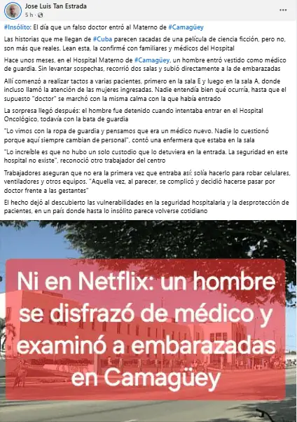 Un insólito y preocupante episodio sacudió recientemente a la provincia de Camagüey, luego de conocerse que un hombre se hizo pasar por médico y logró ingresar al Hospital Materno, donde incluso llegó a examinar a varias embarazadas antes de ser descubierto.