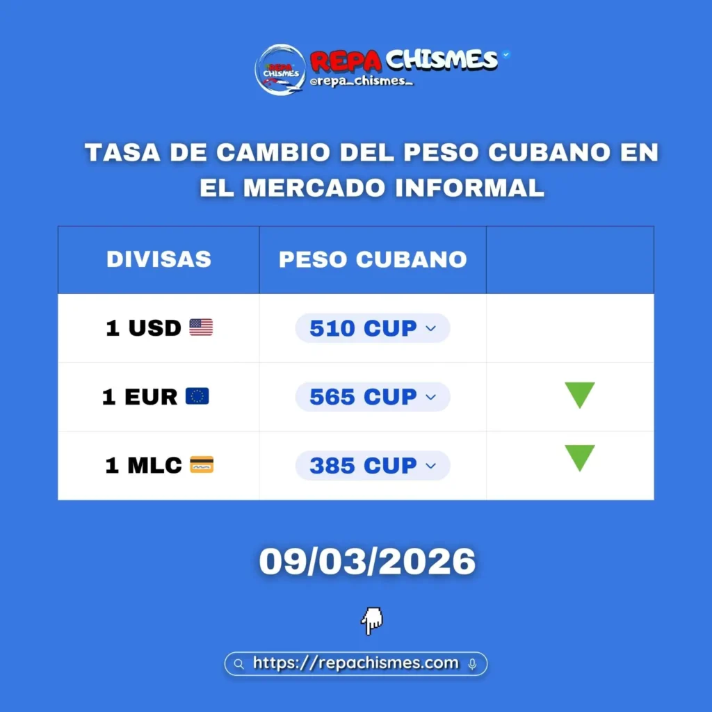 La MLC también experimentó un descenso de la misma magnitud, situándose en 385 CUP, una cifra que la devuelve por debajo del umbral psicológico de los 400 pesos. Por su parte, el dólar estadounidense continúa estable en 510 CUP, nivel que mantiene desde hace aproximadamente diez días.