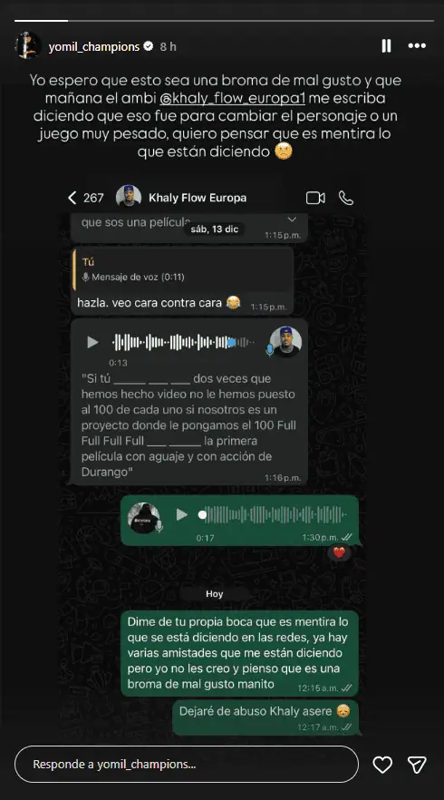 La incertidumbre aumentó cuando familiares cercanos dejaron mensajes ambiguos que no confirmaban ni desmentían la información, lo que provocó aún más especulación. A esto se sumaron reacciones de varios influencers y artistas cubanos. Uno de los más comentados fue Yomil, quien aseguró públicamente que intentó comunicarse con Khaly Flow sin obtener respuesta, aunque también expresó su convicción de que podría tratarse de una estrategia o una broma relacionada con algún proyecto próximo.