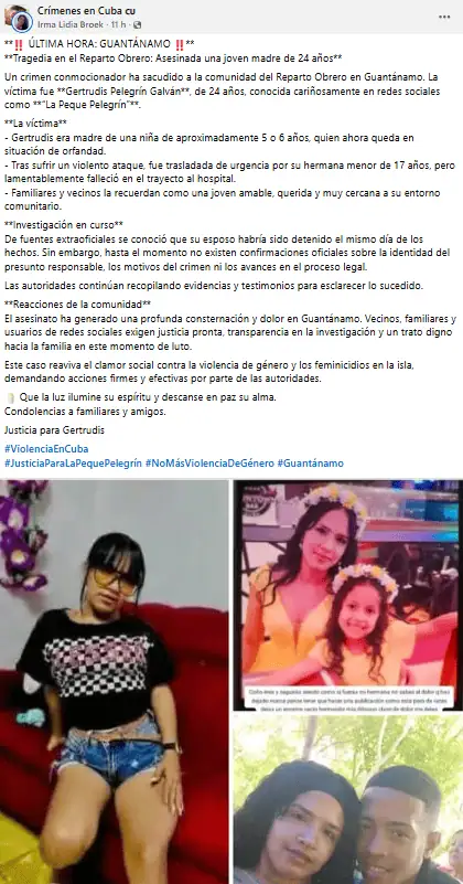 La joven era madre de una niña de alrededor de cinco o seis años, que queda ahora sin la presencia de su madre. Personas cercanas a la familia relatan que Gertrudis creció y pasó gran parte de su vida en el Reparto Obrero, donde era conocida por vecinos y amigos. En redes sociales, muchos la recordaban con el apodo cariñoso de “La Peque Pelegrín”, nombre que hoy se repite entre mensajes de despedida y dolor.