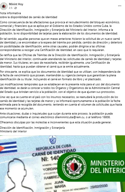 MININT informa que no hay tarjetas para carnets de identidad en Cuba y culpa a Estados Unidos