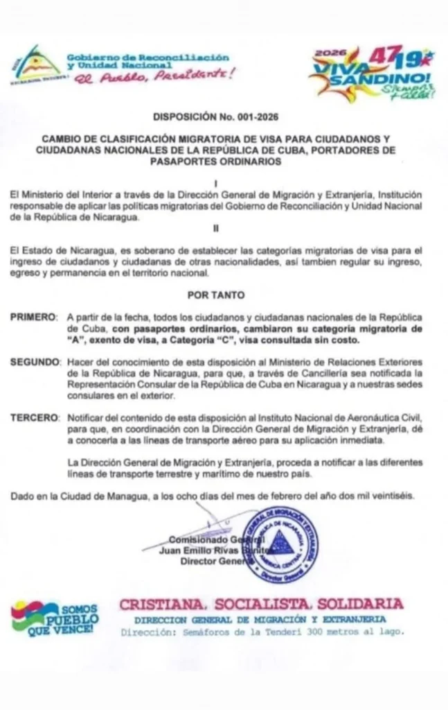 Ahora, con la eliminación del libre visado, esa vía migratoria queda prácticamente cerrada. Las autoridades nicaragüenses notificaron que la decisión será comunicada tanto a la representación consular de Cuba en el país como a las embajadas de Nicaragua en el exterior, además de a aerolíneas y empresas de transporte terrestre y marítimo. El cambio redefine el panorama migratorio regional y deja a miles de cubanos ante un nuevo escenario de incertidumbre.