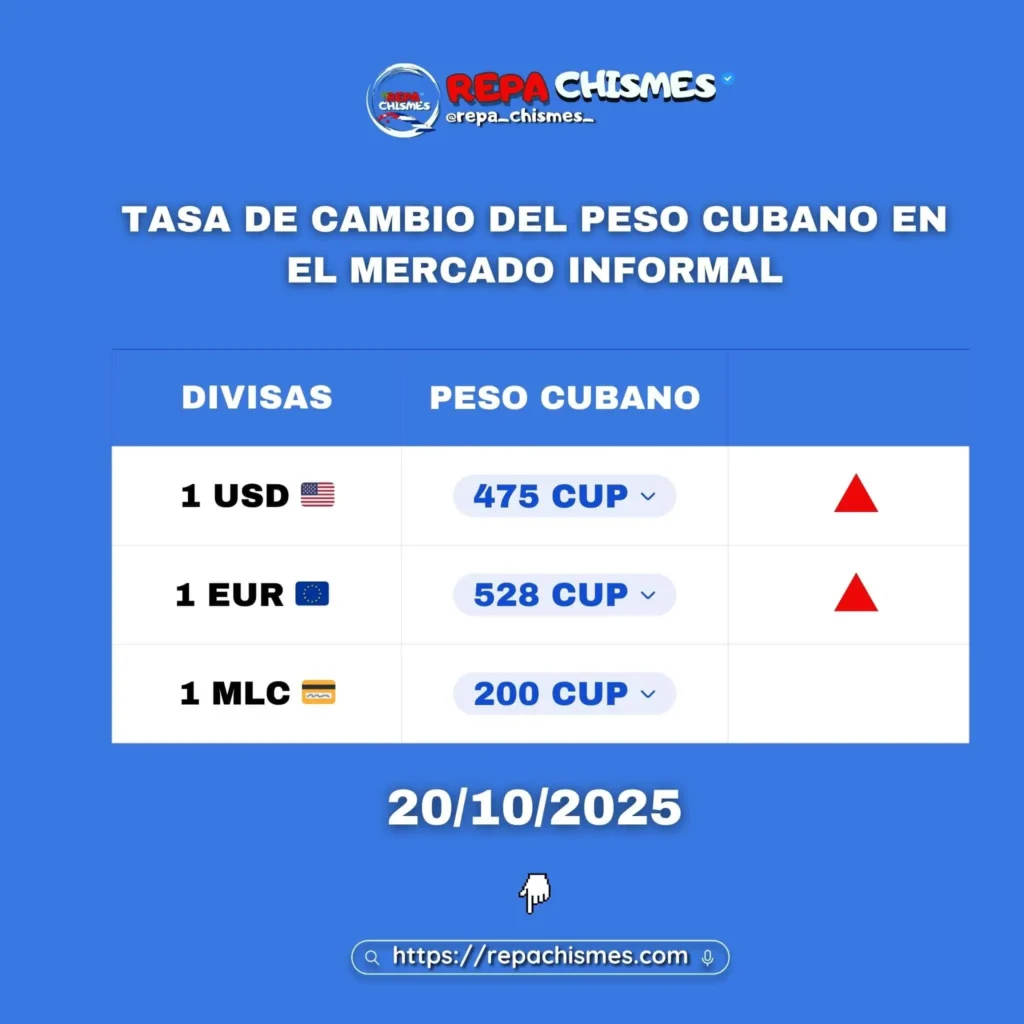 El amanecer de este lunes 20 de octubre de 2025 trajo una nueva sacudida para el mercado cambiario informal en Cuba. El dólar estadounidense (USD) volvió a escalar posiciones y alcanzó los 475 pesos cubanos (CUP), marcando un nuevo máximo en lo que va de año. Por su parte, el euro (EUR) subió a 528 CUP, consolidando su liderazgo como la divisa más fuerte en el mercado paralelo. Mientras tanto, la Moneda Libremente Convertible (MLC) permanece estable en 200 CUP, sin mostrar señales de recuperación o caída.