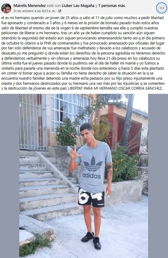 Oscar Corría fue excarcelado el 8 de septiembre de 2024, tras cumplir una condena de tres años y medio en la prisión de Boniato. En aquel entonces, había sido sentenciado por participar en las protestas del 11J, cuando miles de cubanos salieron a las calles exigiendo libertad y mejores condiciones de vida. A pesar de haber cumplido su pena, familiares aseguran que desde su liberación ha sido objeto de constante acoso y amenazas por parte de la Seguridad del Estado.