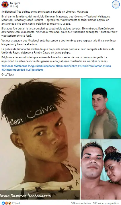 La tranquilidad del barrio Sumidero, en el municipio de Limonar, provincia de Matanzas, se vio sacudida recientemente por un hecho violento que mantiene en alerta a los vecinos. Tres jóvenes, identificados como Yeselandi Velázquez, Maurisdel Fundora y Josué Ramírez, habrían agredido brutalmente a un anciano con la aparente intención de despojarlo de su único medio de sustento: una yegua.