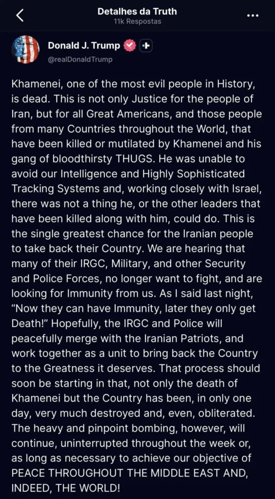 El expresidente aseguró que el líder supremo de Irán habría fallecido y señaló que el hecho se logró con colaboración de Israel. También afirmó que otros dirigentes iraníes habrían muerto y que sectores de las fuerzas de seguridad buscarían inmunidad.