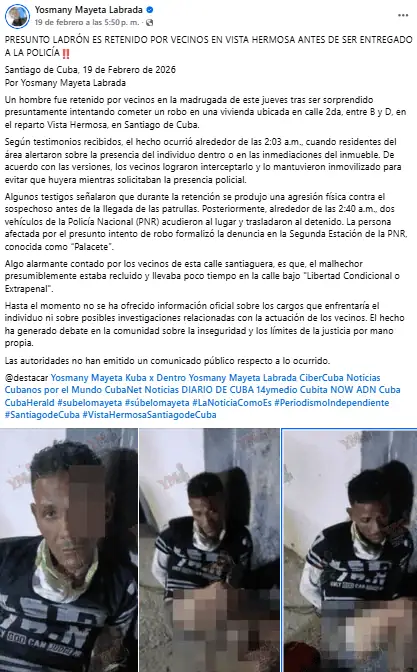 La tranquilidad habitual del reparto Vista Hermosa, en Santiago de Cuba, se vio alterada recientemente cuando varios residentes detectaron la presencia de un hombre dentro de una vivienda de la calle 2da, entre B y D, presuntamente con la intención de cometer un robo. La noticia fue publicada por Yosmany Mayeta Labrada en su página de Facebook, donde compartió detalles recopilados entre los propios vecinos involucrados.